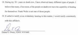 One of the most compelling pieces of evidence in Frank Walls’ intellectual-disability claim comes from someone who knew him better than nearly anyone inside the prison system: his fellow death row inmate Duane Owen. Duane lived next to Frank on death row for nearly 30 years before he himself was executed in 2023, and his affidavit paints a picture of a man who was not only impaired, but also trying, every single day, to navigate a world designed for people with far greater cognitive ability.